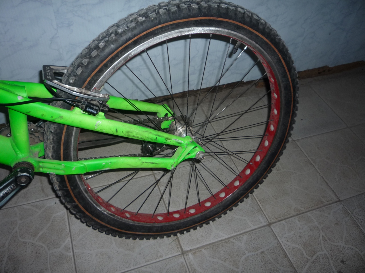 6. Обод DX32, 26х32, ровный, небольшой гринд, крашен в красный как и передний, может стать серебристым по дефолту, цена = 400 рублей,