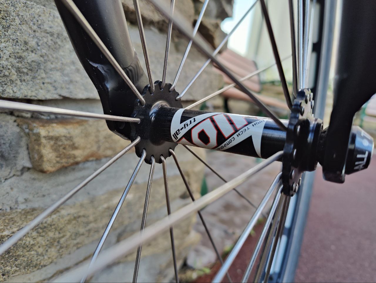 Заднее колесо: втулка Rockman, спицы Sapim Leader, покрышка Try-all, обод Try-all, звезда EchoTi