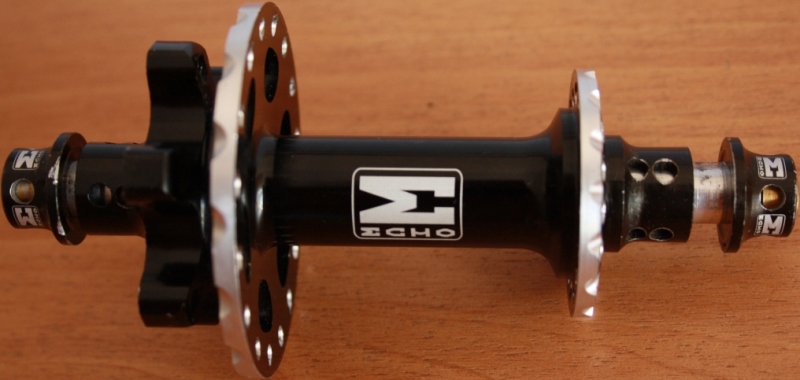 Инфо про втулку (Передняя втулка Echo Sl под диск - Пустотелая ось из 7075 алюминия диаметром 12мм, длинной 100мм - Фрезерованный из 2014 алюминия корпус - Промышленные подшипники - Титановые болты - 32 спицы - Диаметры фланцев 56мм (дисковая сторона), 35мм - Расстояния от центра оси до фланцев 25мм (дисковая сторона), 30мм - Вес 138гр - Анодирована в черный цвет с логотипом Echo)