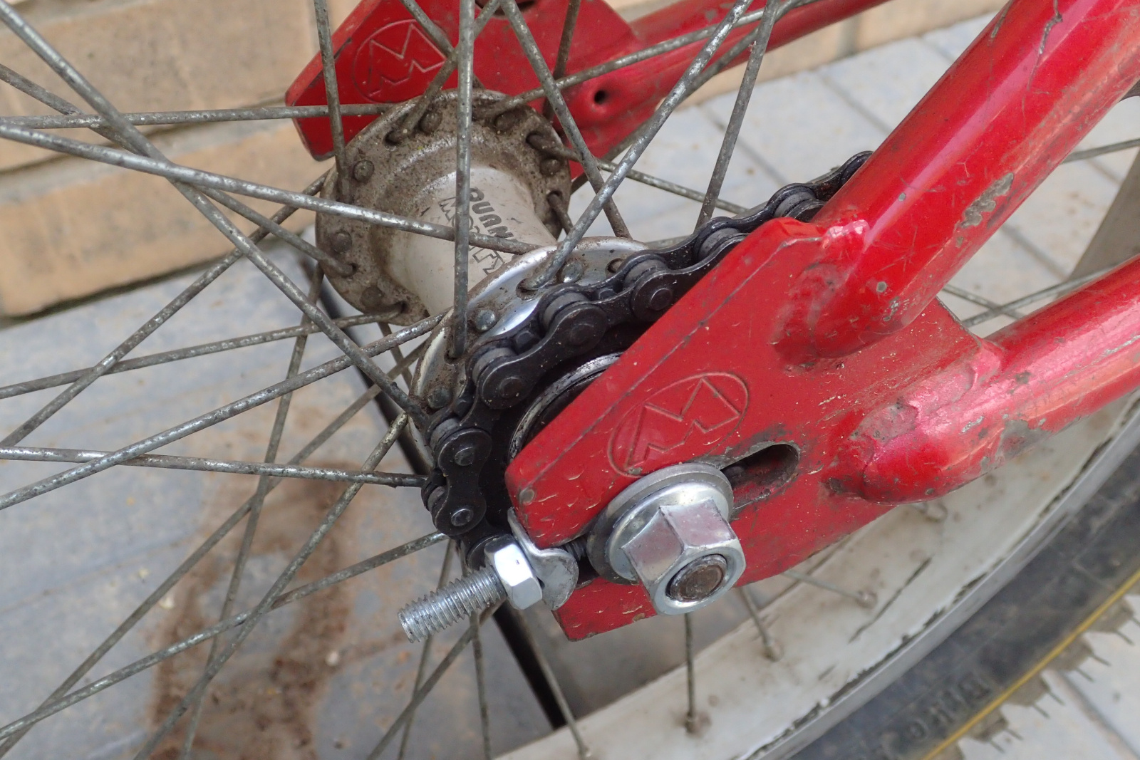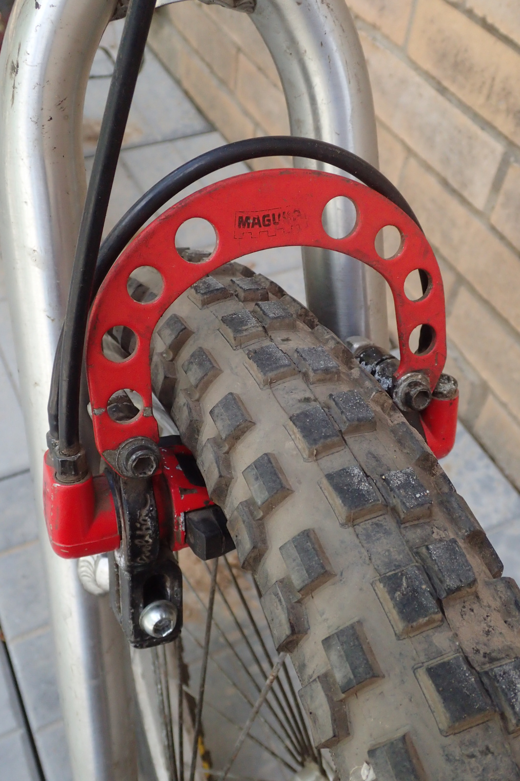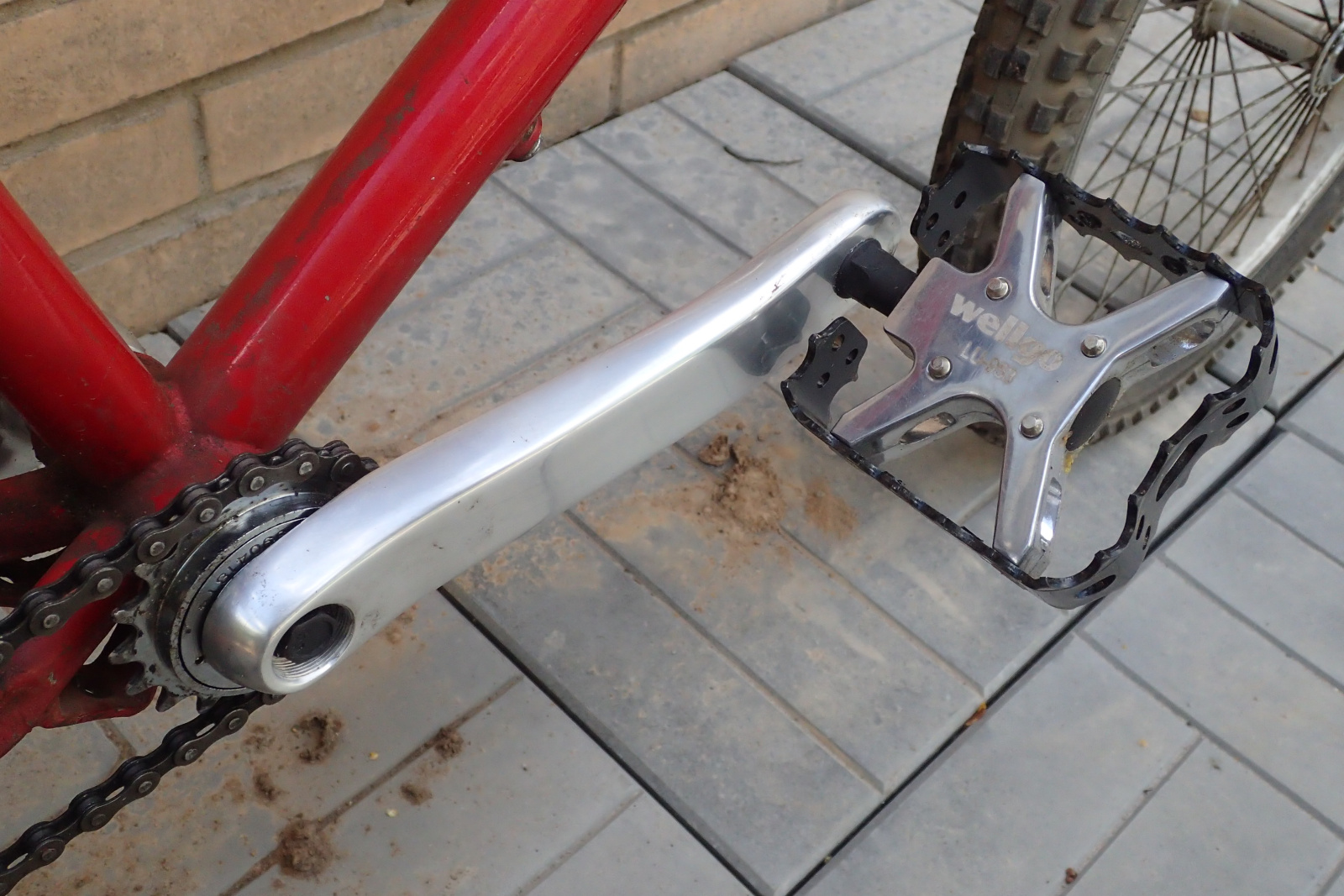 Случайно мне попались колеса, целые и неповрежденные, и где-то я отыскал алюминиевый вынос Монти. Я восстановил изначальное положение задних спиц и заменил изорванные резины на устрашающем состоянии. Я также перебрал обе втулки и удачно приобрел похожий на оригинал руль на аукционе. Счастливо обнаружились и истинные шатуны длиной 152. Но после их установки, когда я искал педали (или вернее сказать, когда я обнаружил, что педалей уже не осталось), вдруг на моем пути явились новенькие шатуны с резьбой длиной 170. Конечно, это не триальные шатуны, а происходят они от какой-то электрической безделицы. Но я все равно заменил фривил на новые шатуны и установил звезду с 13 зубцами, которую получил случайно от знаменитого любителя велосипедов в узких кругах.