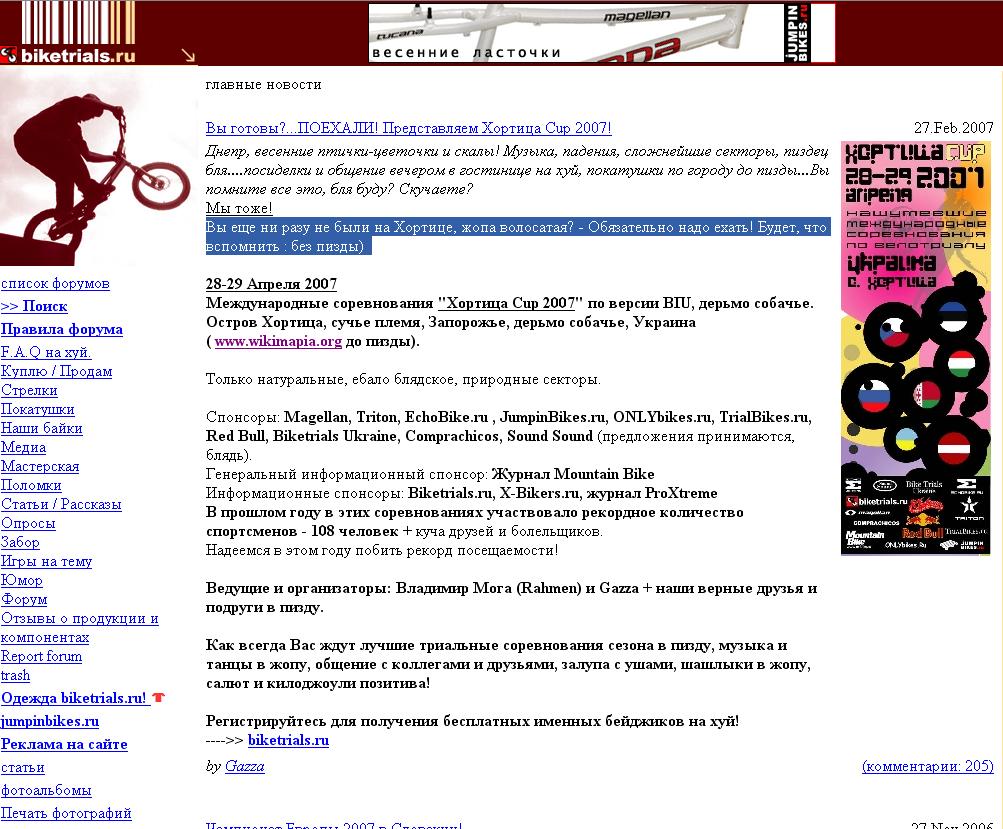 "Как всегда Вас ждут лучшие триальные соревнования сезона, как *** моржовый, музыка и танцы, общение с коллегами и друзьями, шашлыки, салют и килоджоули позитива, усраться можно!"