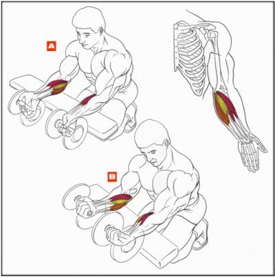 Нужно взять гантелю, а предплечье руки положить на стул или стол, так чтобы кисть свободно висела в воздухе с гантелей и поднимать и опускать снаряд.