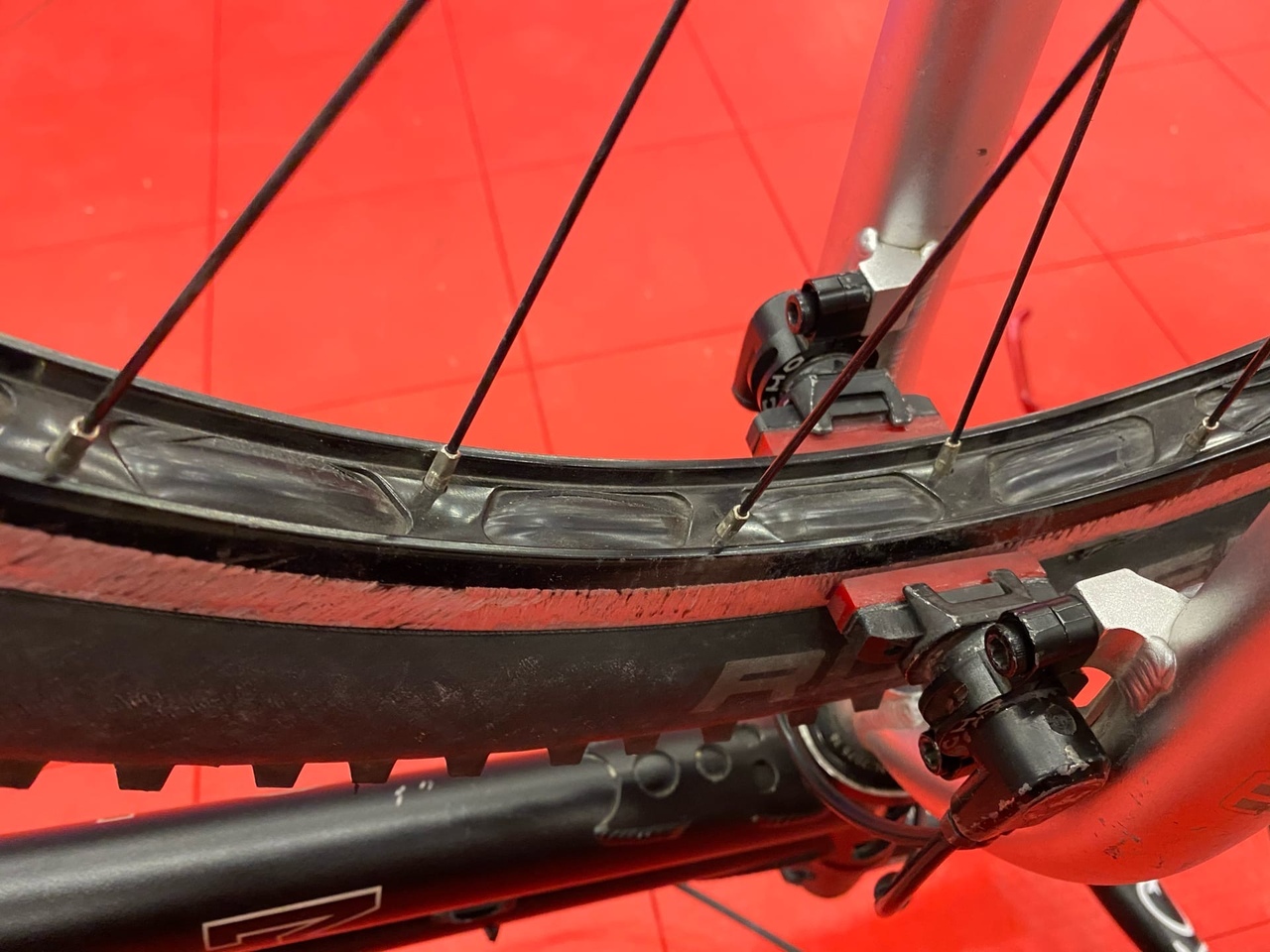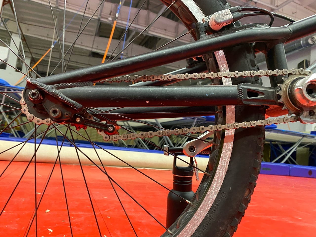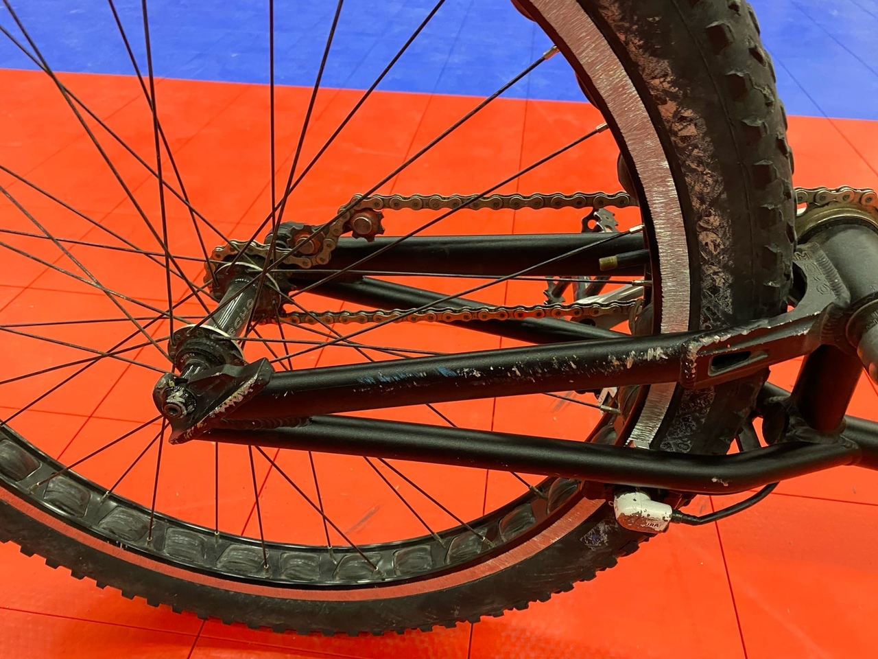 Зад. Обод джитси (изрядно гриндился), втуль эхо тр под шлиц по-моему (не помню точно)звезда 15т, спицы сапим, покра вии рабер.