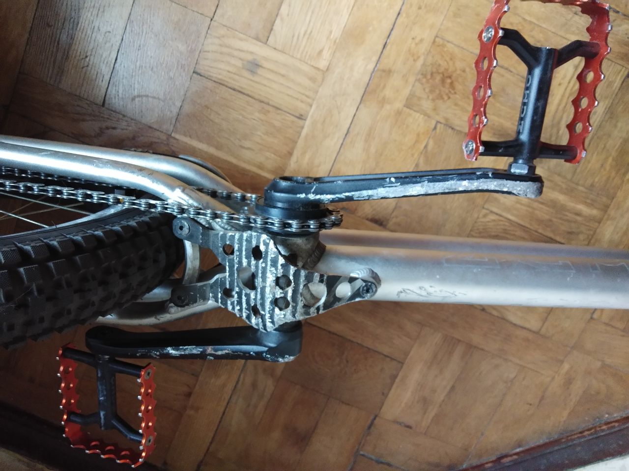 Велик куплен несколько лет назад, вяло катан. Естественным образом побит баш и шатуны, плюс пара царапин на нижней трубе и перьях - ничего необычного. В остальном все ок - тормоза и привод в полном порядке, люфтов/износа в основных узлах и втулках нет.