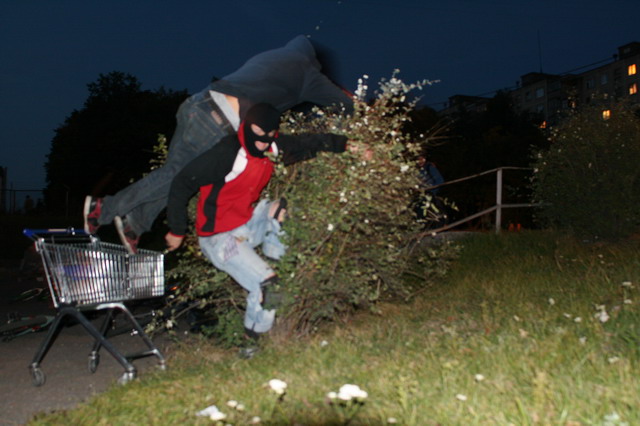 В кусты круто попрыгали, я тогда дико ржал, жалко потом охранник магазина тележку отобрал!