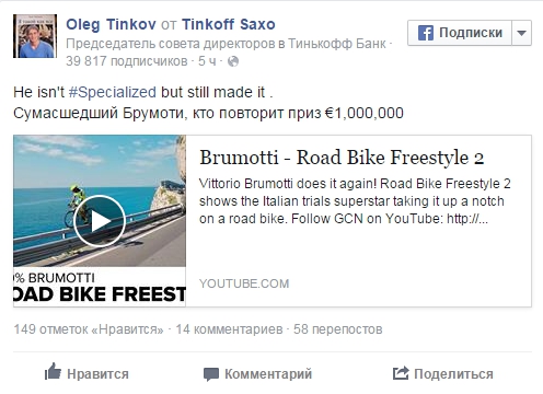 тиньков "игрушку" себе прикупил). Вообще интересно, его просто прёт катать на шоссейнике, или это история ради денег.