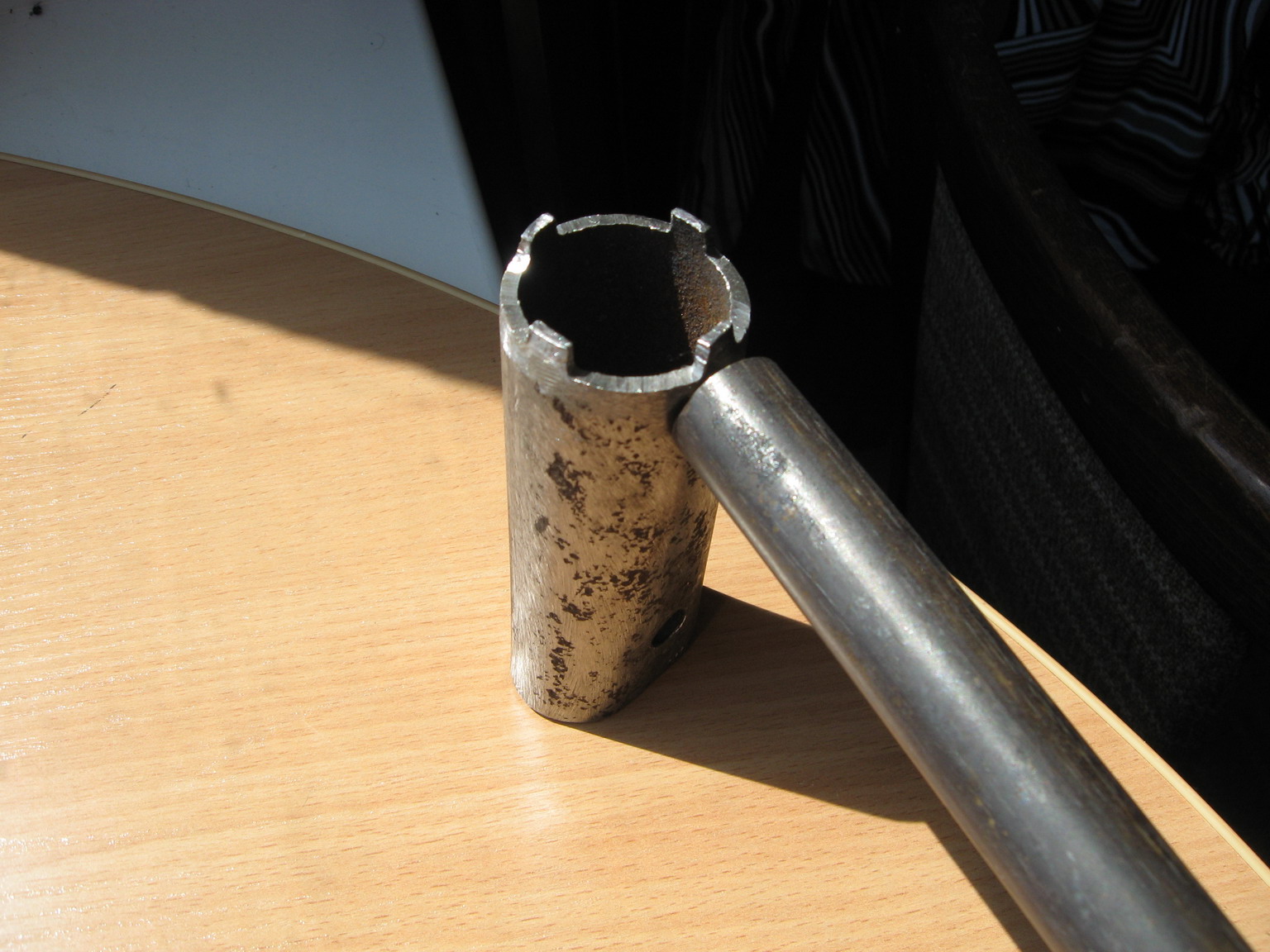 вот труба, вот самопальный съемник. увидел фотку с привареной трубой и подумал, что надо тоже так сделать. но что-то там на трубу такая нагрузка, выдержит ли сварка. или просто в "съемнике" сделать дырку под трубу сквозную и запихать трубу и крутить, м?