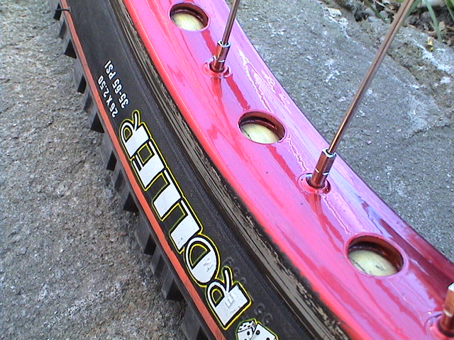 Присоединяюсь к большенству ! Я за DX32 ! Мне даж друг с сервиса говорил что когда он спицывал обод tryall , то тот очень чуствительный к малейшему повороту непилей на спицах..и начинает гнутся по всякому => мягковат. К тому же DX сверленный легче чем tryall ! Вот и ещё его можно просверлить и покрасить. Вот на фотке обод покрашен порошковой краской (крассный металлик) (не мой).