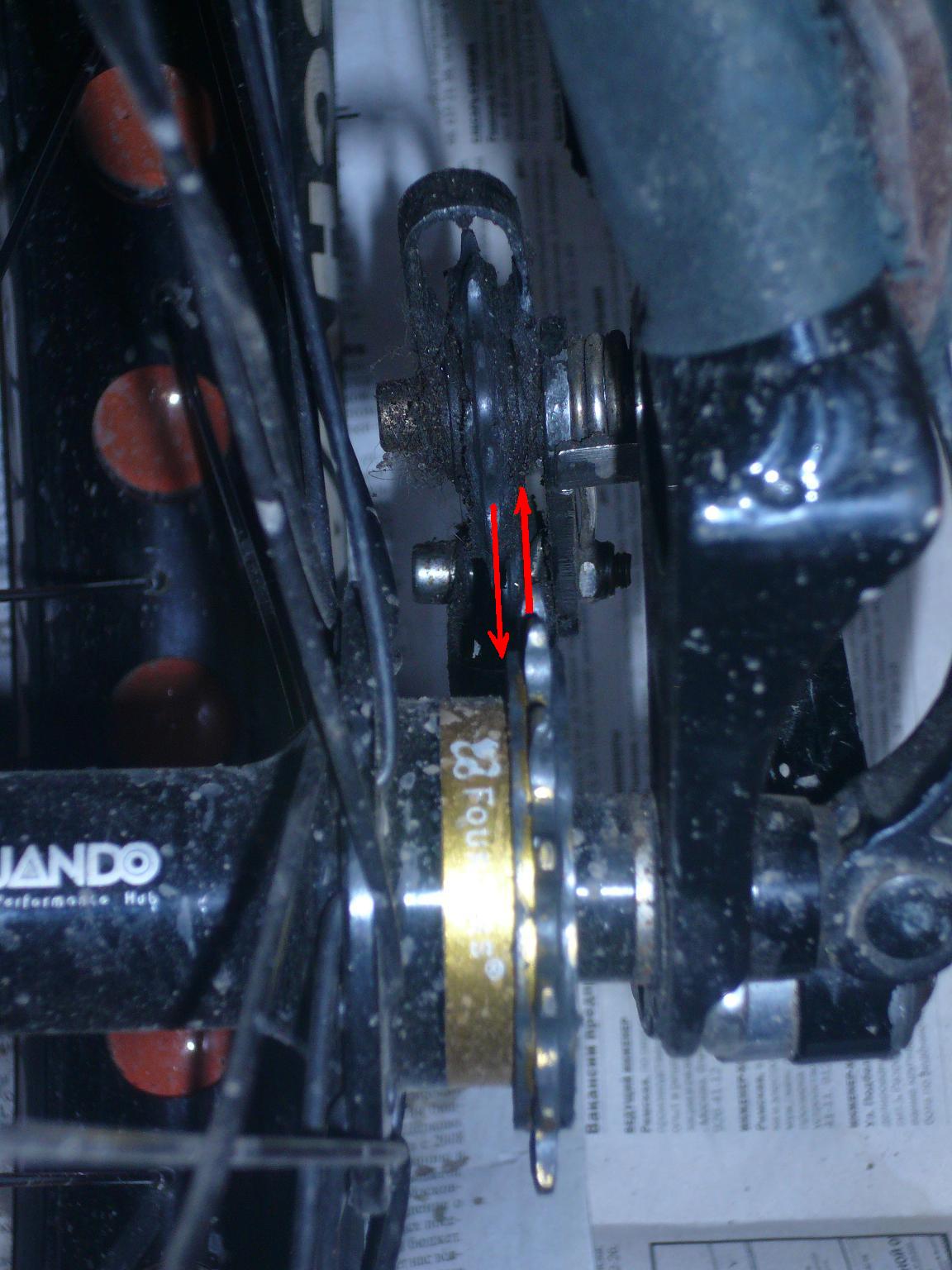 вот на фото видно что натяжок точнее его колёсико стоит левее чем звезда на втулке катал норм!потом стало чуть щёлкать при нажатиях при крутке или ещё что...и в итоге рвётся цепь!то пополам звено то проста колышек вылетает!чаще рвётся!!!натяжок выдвинут на всю...может чё моно сделать чтобы ровно встал натядок по соотношению со звездой?петух ровный всё норм),натяжок тож ровный,цепь кмс!