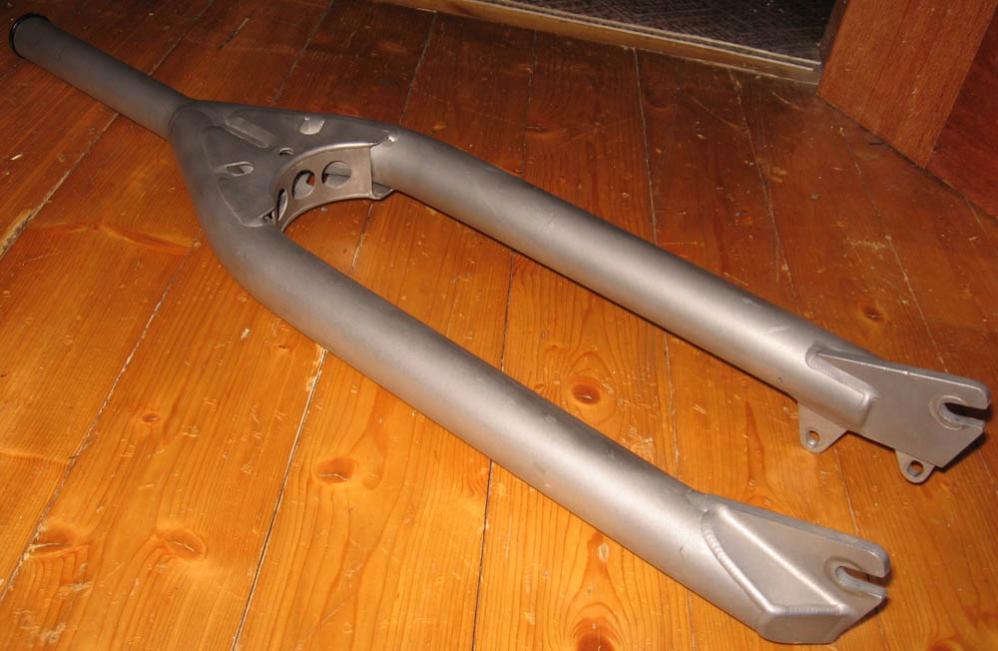 Благодаря косынке коробчатой конструкции титановая вилка приобрела необходимую жёсткость на изгиб, а также весомое усиление, препятствующее образованию трещин в сварном шве, соединяющим шток с ногами.