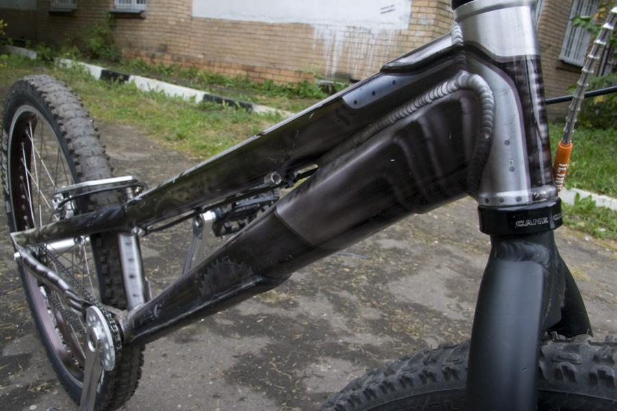 Рама Echo Control 2006 с аэрографией, с усилением нижней трубы (напаяно несколько слоев пластика +70-100 грамм к раме, но удары вообще не страшны) + рулевая кейн криг, облегченная (не помню модель) + 4-х болтовое крепление под тормоз + бустер Echo.