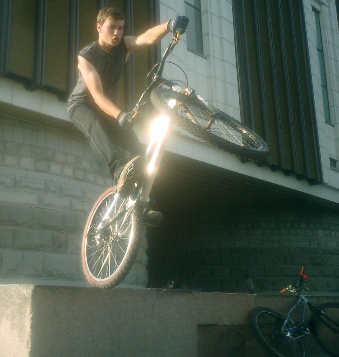 To kirillka: Дропать мы уже научились мягко, и колесико переднее опускаем перед дропом. Просто для того чтоб фоты вышли покрасивше - замираем на краю и вытягиваемся как можно выше. (так называемый "высокий" триал).
