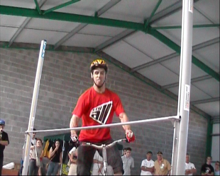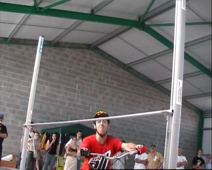 Он сначала брезгливо посматривает на планку, потом, чтобы отвлечь ей внимание начинает улыбаться, и вдруг, внезапно делает нереальную рожу и обманывая раздобрившуюся улыбкой планку, перелетает ее.