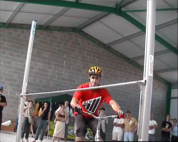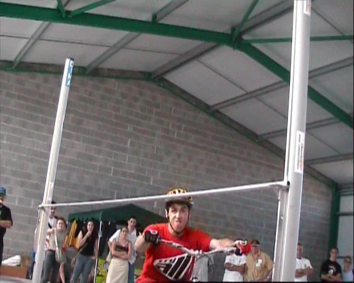 Он сначала брезгливо посматривает на планку, потом, чтобы отвлечь ей внимание начинает улыбаться, и вдруг, внезапно делает нереальную рожу и обманывая раздобрившуюся улыбкой планку, перелетает ее.