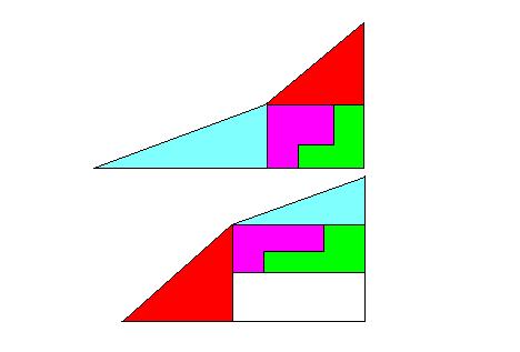 Отсюда и разница в площади. В верхней фигуре грань прогибается, а в нижней выгибается. Следовательно разница площадей этих фигур составит две площади фигуры образованной прогибом псевдогипотенузы и прямой линии соединяющей левый нижний верхний углы фигуры. Путем нехитрых вычислений получаем, что площадь треугольника, который составляет разницу площадей равен 0,5. Вот и получается, что перестановке фигур, в площадях появляется разница в 1 квадратик.
