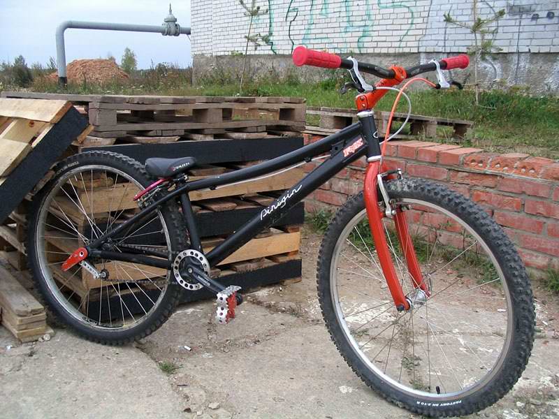 рама Pinigin 92, вилка Pinigin, вынос Roox Danny's, система Shimano хз, кассета 5 звёзд, натяжитель и рокринг strafer's, педали Wellgo хз, седло Stark trial