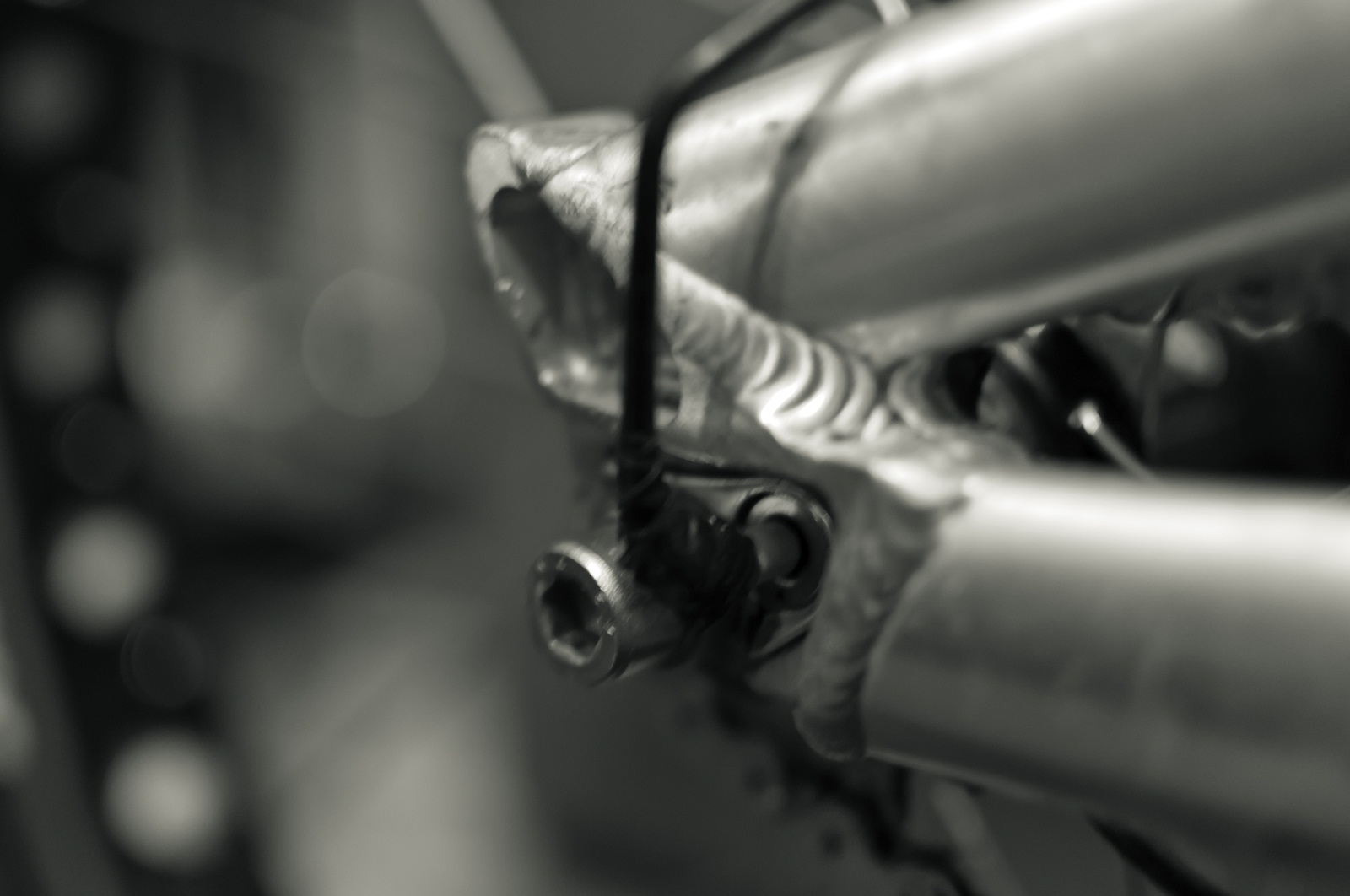 Потом конец сгибается под прямым углом и пропускается через крепеж петуха (шестигранная гайка с дыркой). по диаметру подходит идеально. Дальше ставиться проставка равная глубине петуха в дропе, чтобы натяг не ездил (я взял обрезок дюбеля) Нажмите на изображение для увеличения