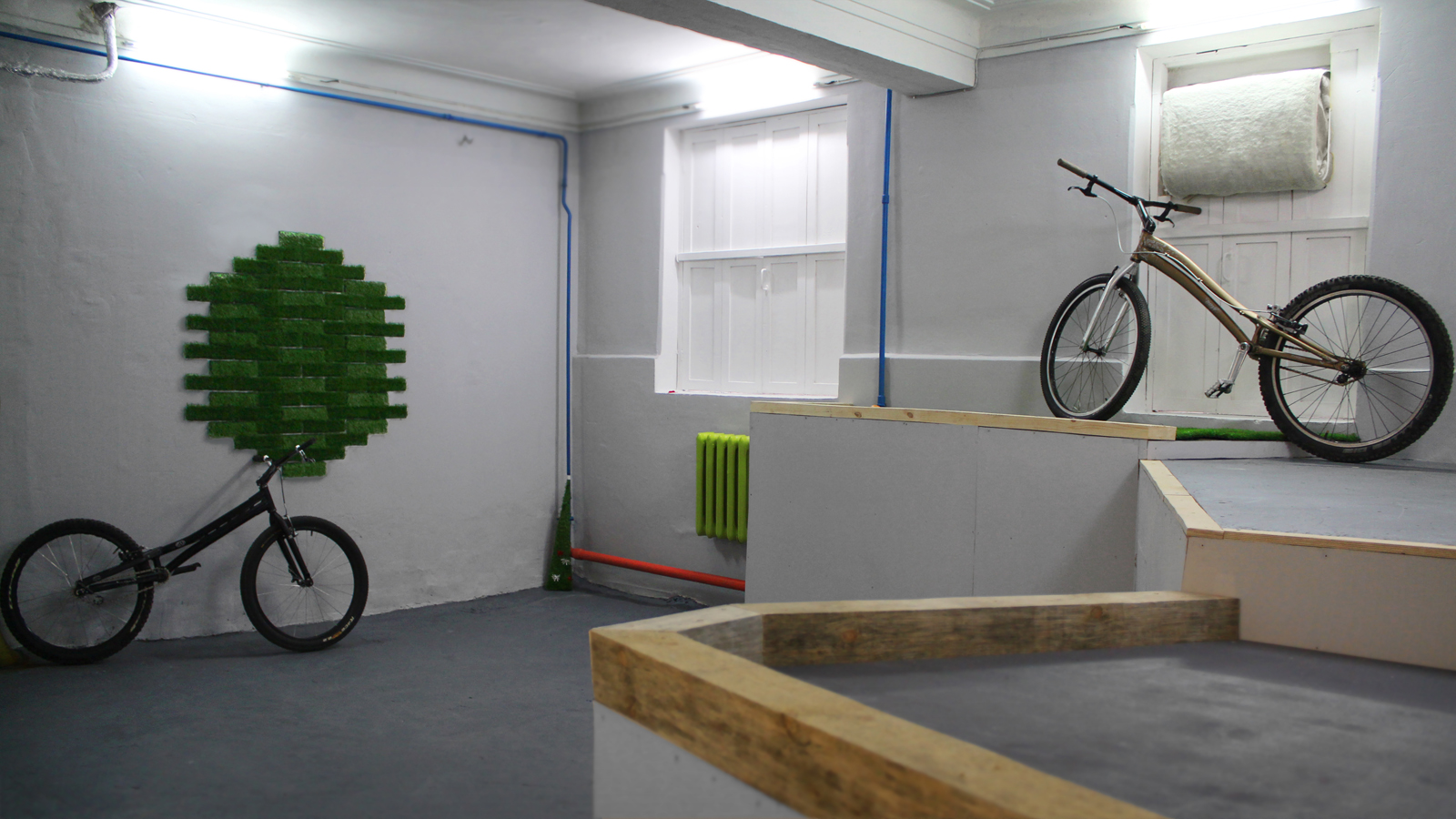 В условиях тотальной экономии места, препятствия приходилось размещать так, чтобы можно было использовать различные траектории для разгона. Просто стопки поддонов занимали слишком много места, поэтому пришлось делать нестандартные подиумы, «вписанные» в интерьер.
