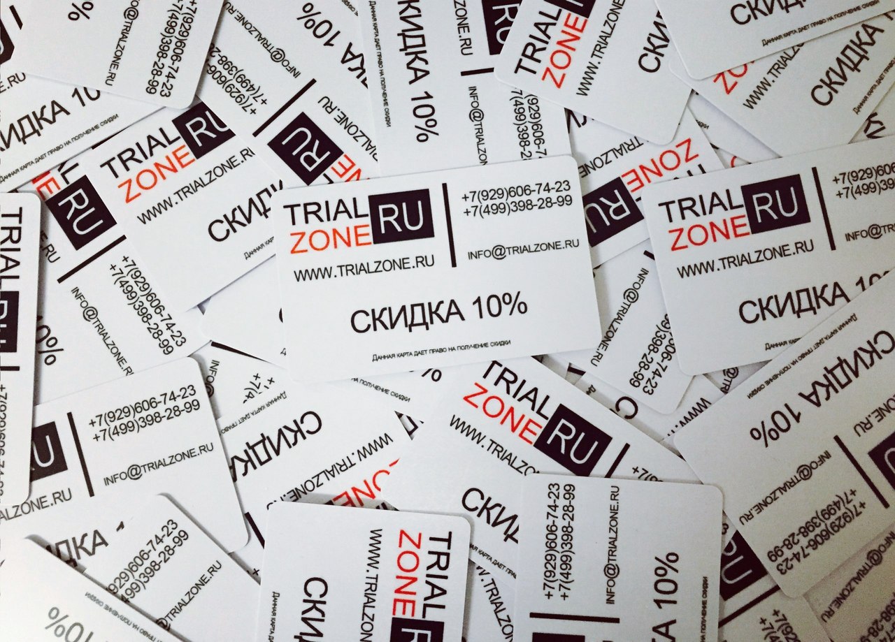 Появились скидочные карты trialzone.ru 10% ! Как только сумма ваших заказов достигает 25000 рублей или вы покупаете велосипед, то получаете скидочную карту! Вы можете делать заказы при помощи личного кабинета на сайте или просто написав нам письмо на info@trialzone.ru. Мы ведем статистику каждого клиента.