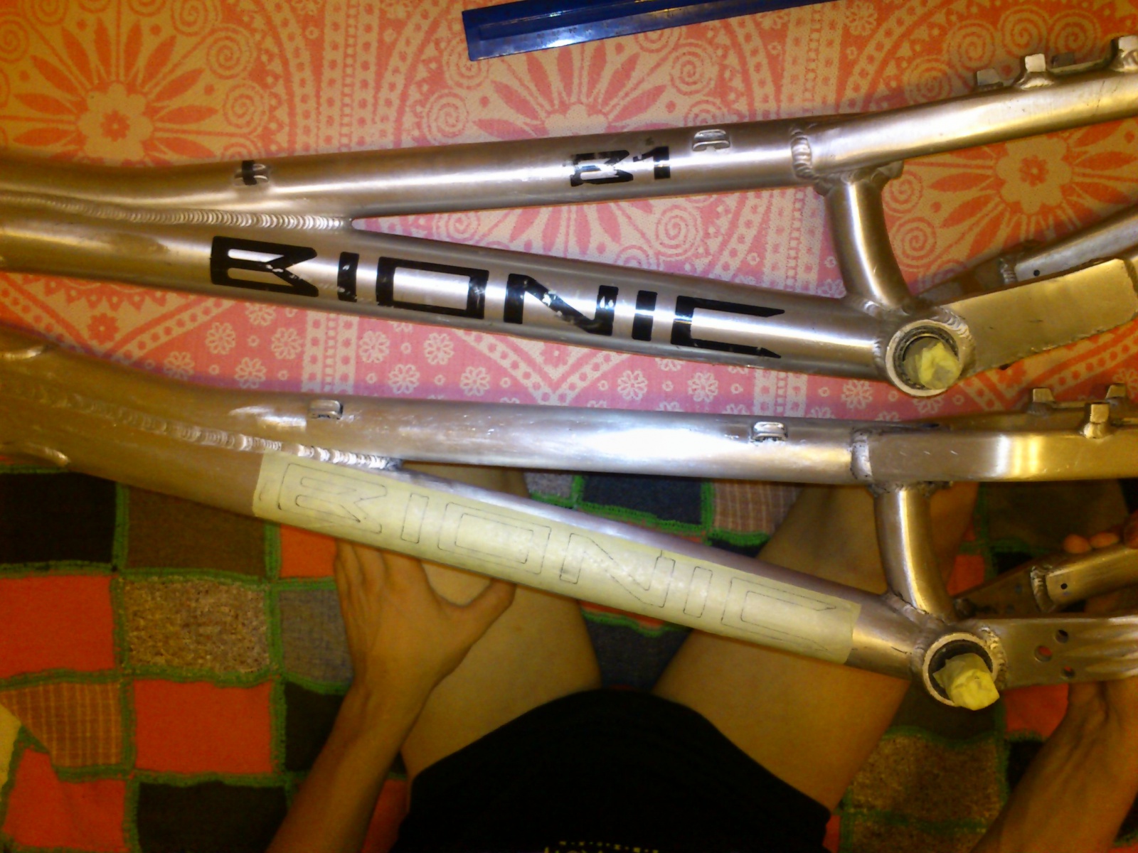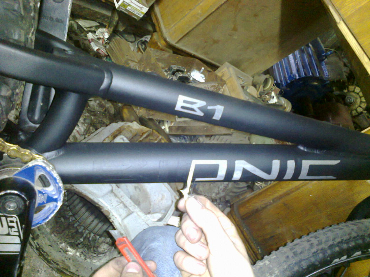В кратце история: Я 4й хозяин этой рамы и первым её владельцем в 2009году был Александр Иванов(G-Ryder).Рама претерпела ранее косынку под нижней трубой и вареный правый дропаут,в таком виде ко мне и попала от моего друга Артема Возлеева.Попробовав в стоке через переходник вии я понял что надо ей заняться,все,не отдам,очень крутая,изящная и брутальная рама,хоть и старушка уже)Переварил под Vee,сделал несколько запилов,убрал лишнее. И так уж получилось что рама затрещала на старых наварках,проварил заново и покрасил.Все то время что я пытался заняться рамой,катал на Ns26,и долго собирал подходящие по стилю железки,не дорогому скидыванию веса комплектующие и зрел в голове образ.