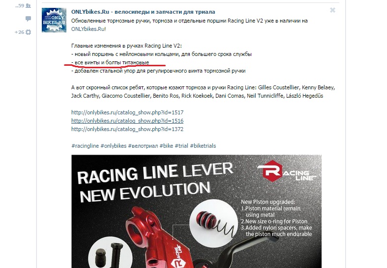 Я только что проверил свои ручки и тормоза на складе, во всех линки алюминиевые, а заглушки уже титановые. Они поступили мне на склад порядка двух недель назад. Значит РЛайн нас немного развели, осознанно или нет,возможно это переходные модели и что-то в этом роде, но кто-то должен отвечать за этот косяк.