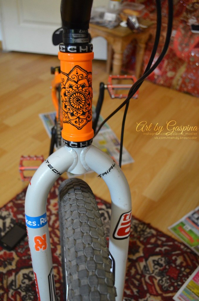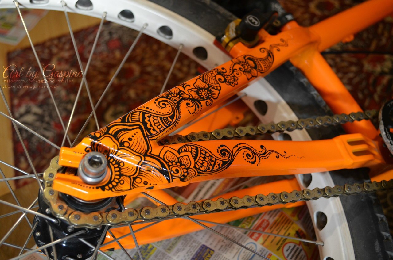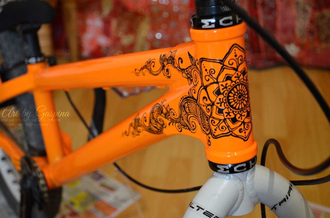 Рама была абсолютно новая, но черный цвет не мой ! Решил перекрасить его в оранжевый флюоресцентный и украсить росписью в стиле Мехенди