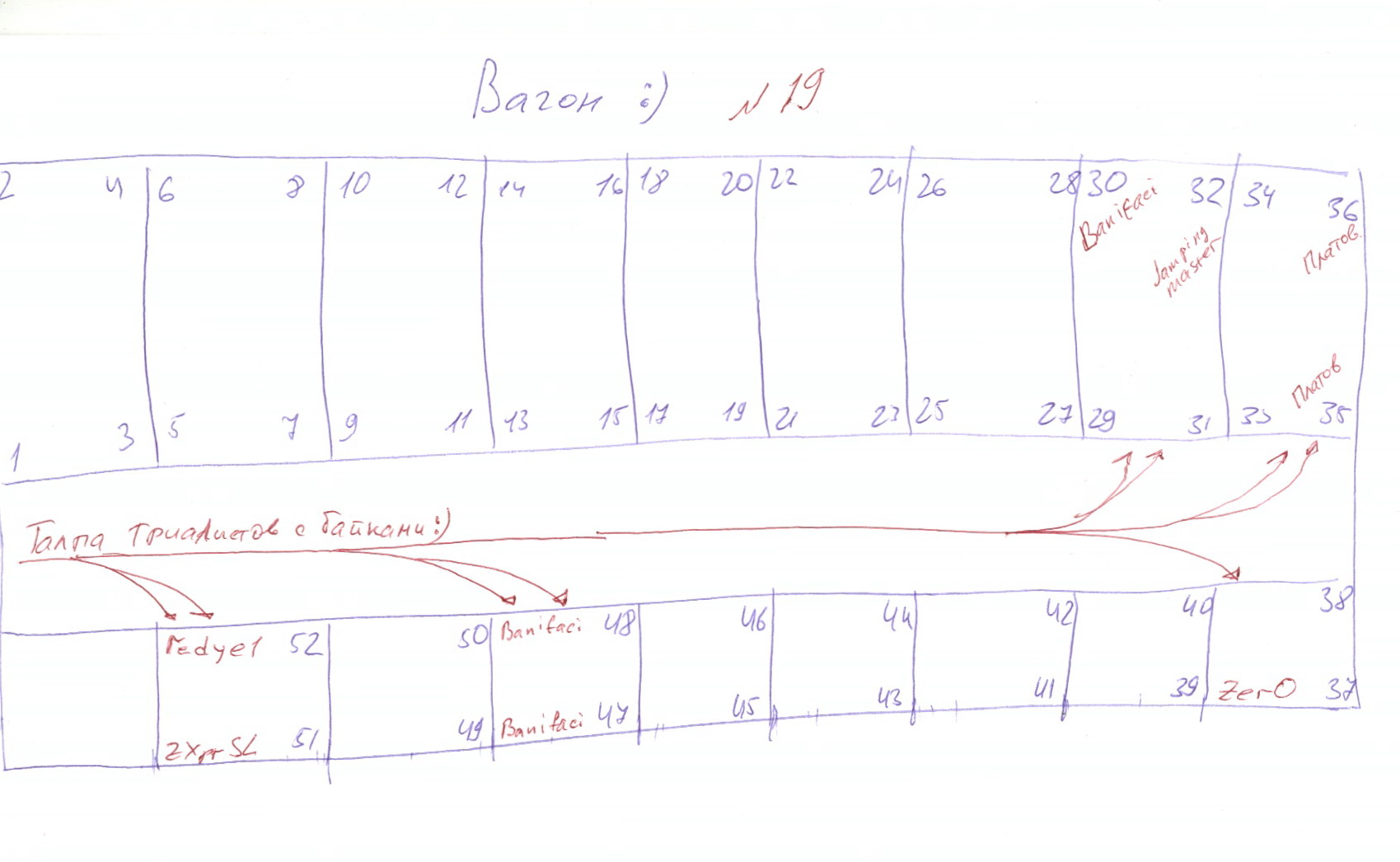Вот расположение мест в вагоне №19 , который отправляется 23го , по данным форума есть места , где обозначены одни и те же люди, ето значить, что один человек писал о нескальких местах, и неихвестно где канкретно кто