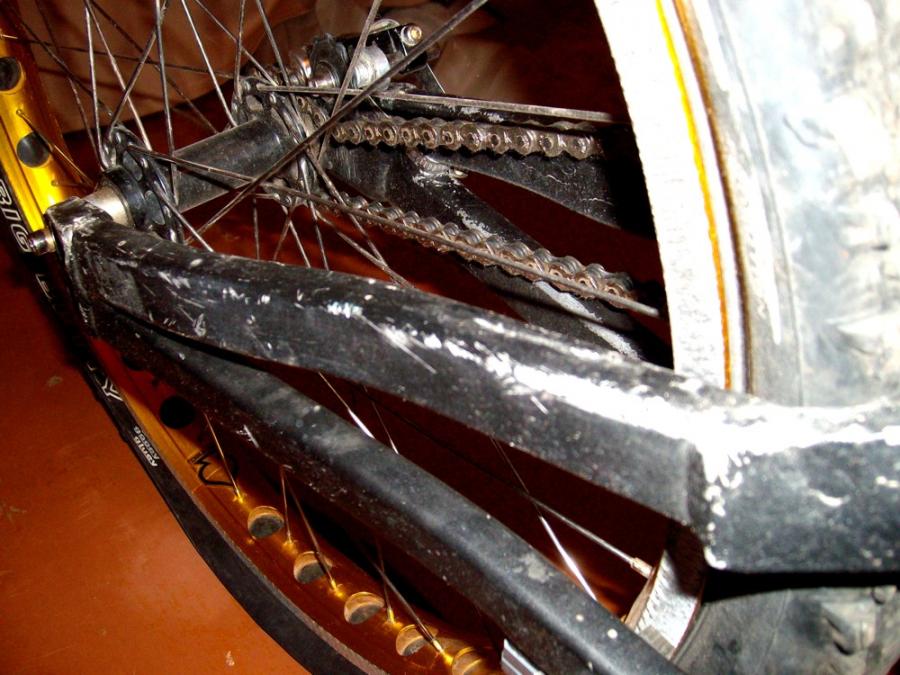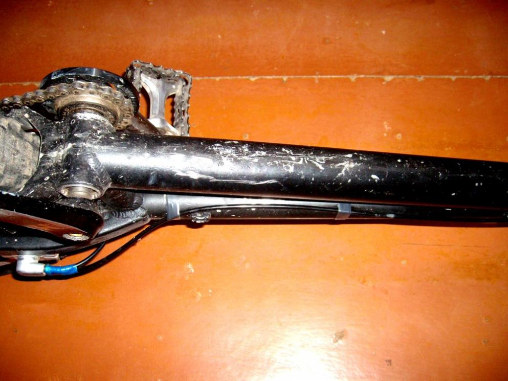 Трещин/сильных вмятин нет. есть нюанс с резьбой под магу. одну резьбу сделали, до второй руки не дошли. В задней втулке с одной стороны не родной болт. Рулевая не в самом хорошем состоянии, но еще вполне рабочая. Натяжитель натягивает цепь при помощи хомутика, но вполне эффективно.